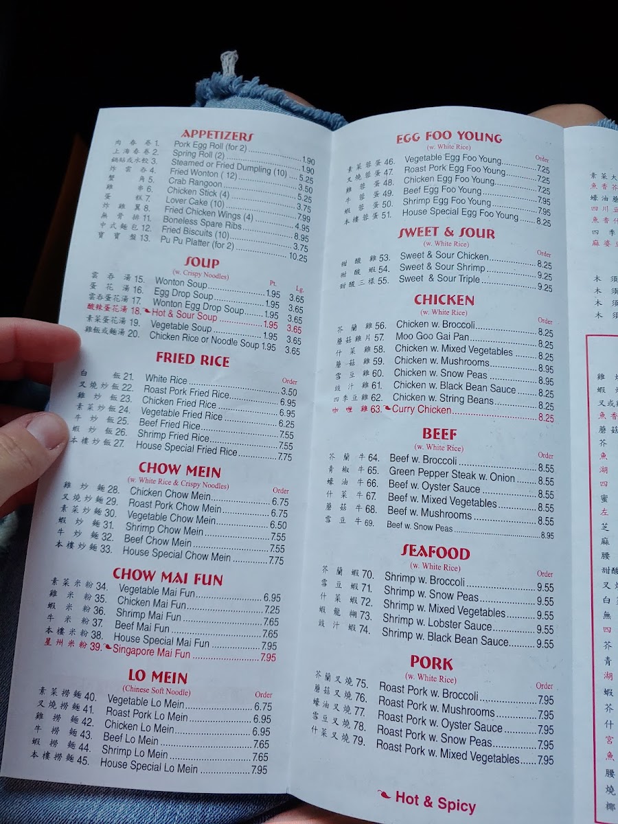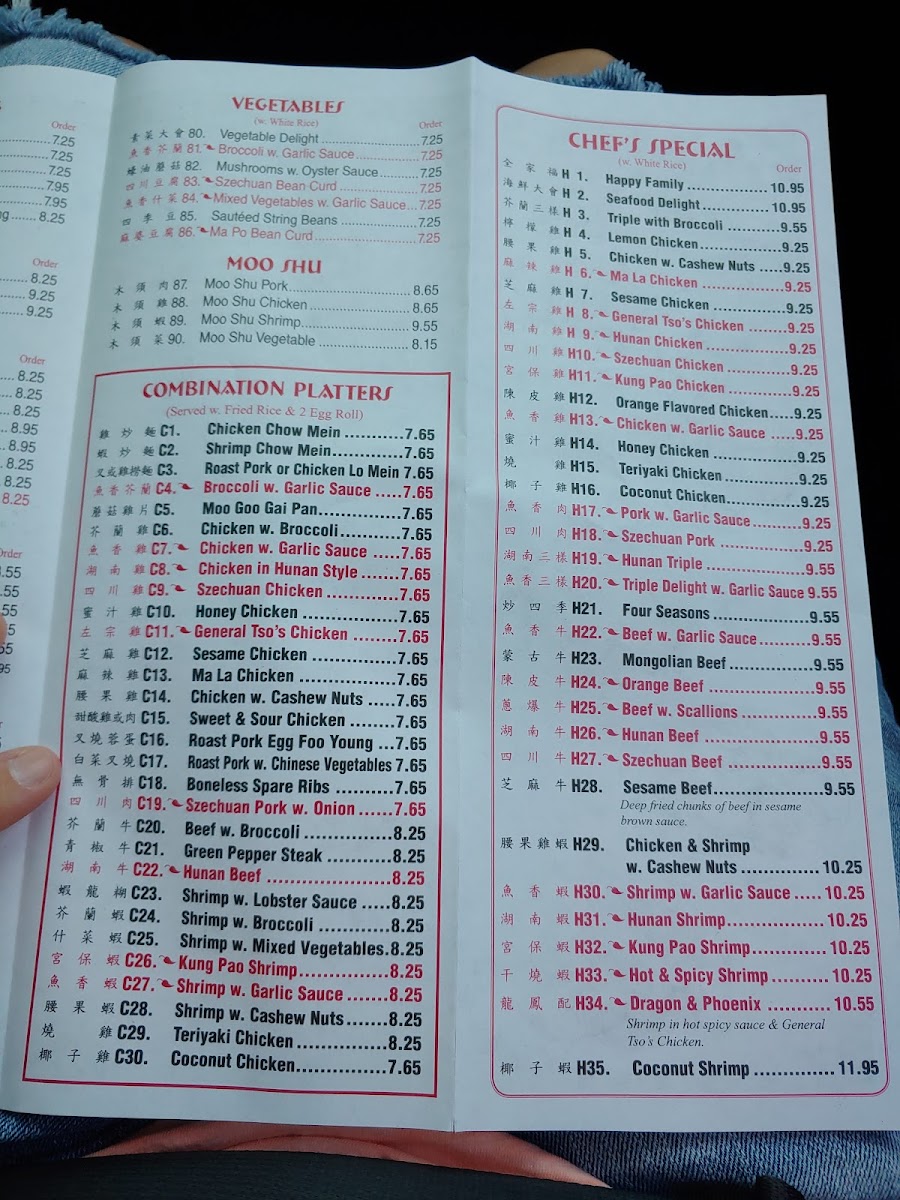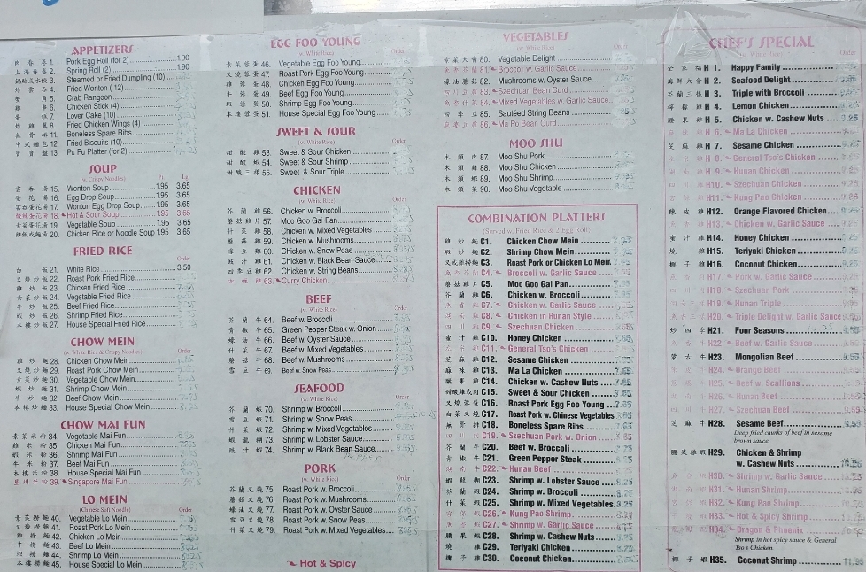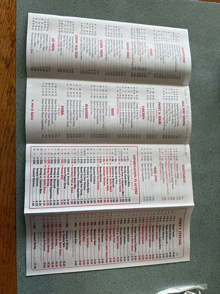 Beyond the buffet, the menu is organized into multiple food categories that feature a range of poultry, beef, and seafood dishes. This includes chicken preparations such as chicken chow mein, chicken with broccoli, Kung Pao chicken, General Tso’s chicken, and various other sauces like garlic sauce and oyster sauce. Beef options include beef with broccoli, pepper steak with onion, and Hunan beef. Other dishes include chicken or roast pork egg foo young and mushroom-based dishes like moo goo gai pan.