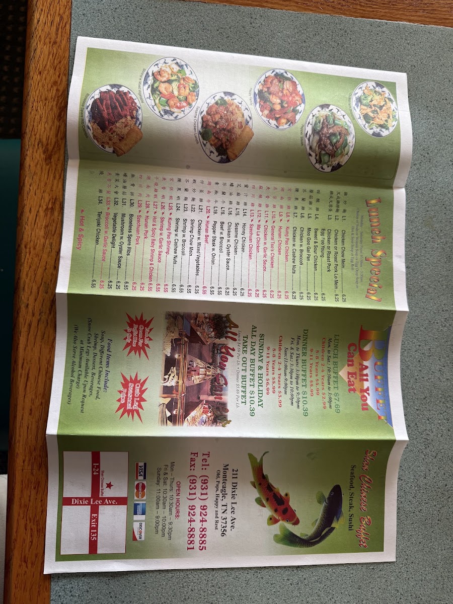 The menu features a variety of Chinese cuisine options primarily presented through an all-you-can-eat buffet available during lunch and dinner. The buffet includes a selection of classic Chinese dishes such as egg drop soup, shrimp with broccoli in garlic sauce, orange chicken, shrimp with cashew nuts, boneless spare ribs, and lo mein noodles. Additionally, items like mix tempura, California rolls, and fish on rice are offered as part of the buffet choices.